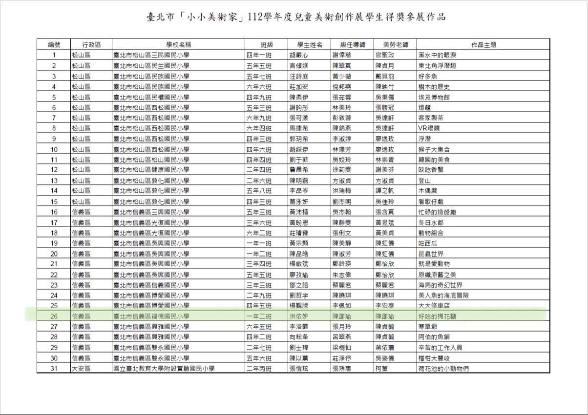 賀!!!本校一年二班洪依妍同學 參加112學年度兒童美術創作展比賽