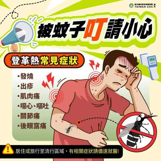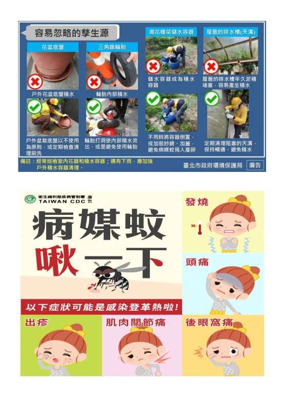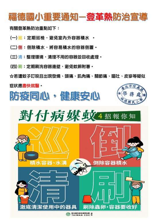 防範登革熱,落實「巡、倒、清、刷」,大家一起動手清除室內外積水容器,以避免孳生病媒蚊,如出現發燒、頭痛、後眼窩痛、肌肉關節痛、出疹等登革熱疑似症狀,請儘速就醫,主動告知活動史及接觸史!