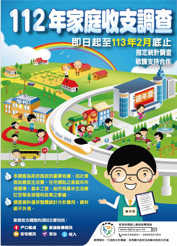 112年臺北市家庭收支調查即日起開始辦理,訪查項目包括家庭收入、支出、設備及住宅概況,敬請民眾支持配合, 如有任何疑問敬請撥打(02)27208889/1999轉 7651-7656。