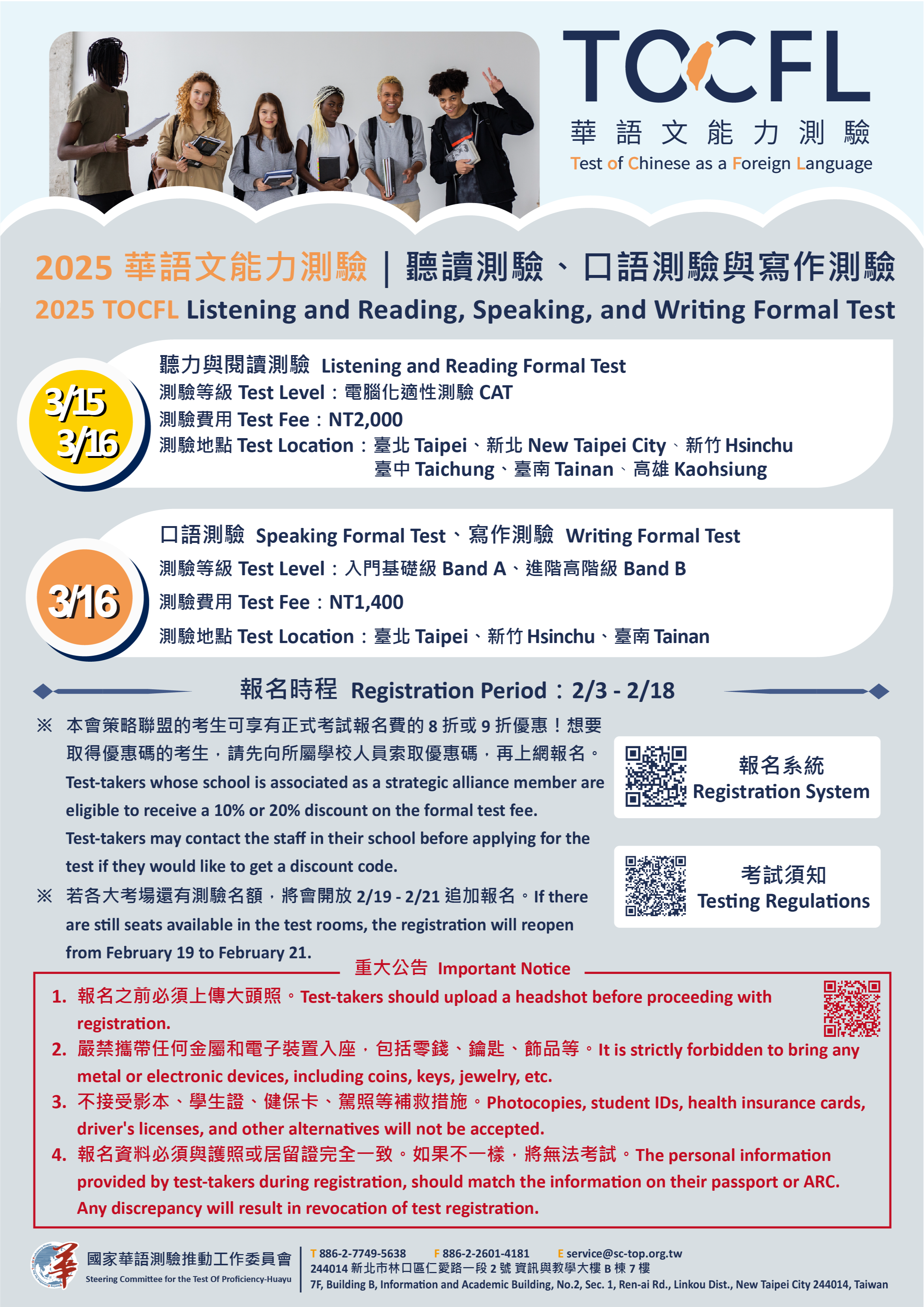 二、報名時程:114年2月3日(星期一)至2月18日(星期二) 止,報名截止日後,若有剩餘名額,將開放追加報名至2月 21日(星期五)止。 三、測驗日期與項目