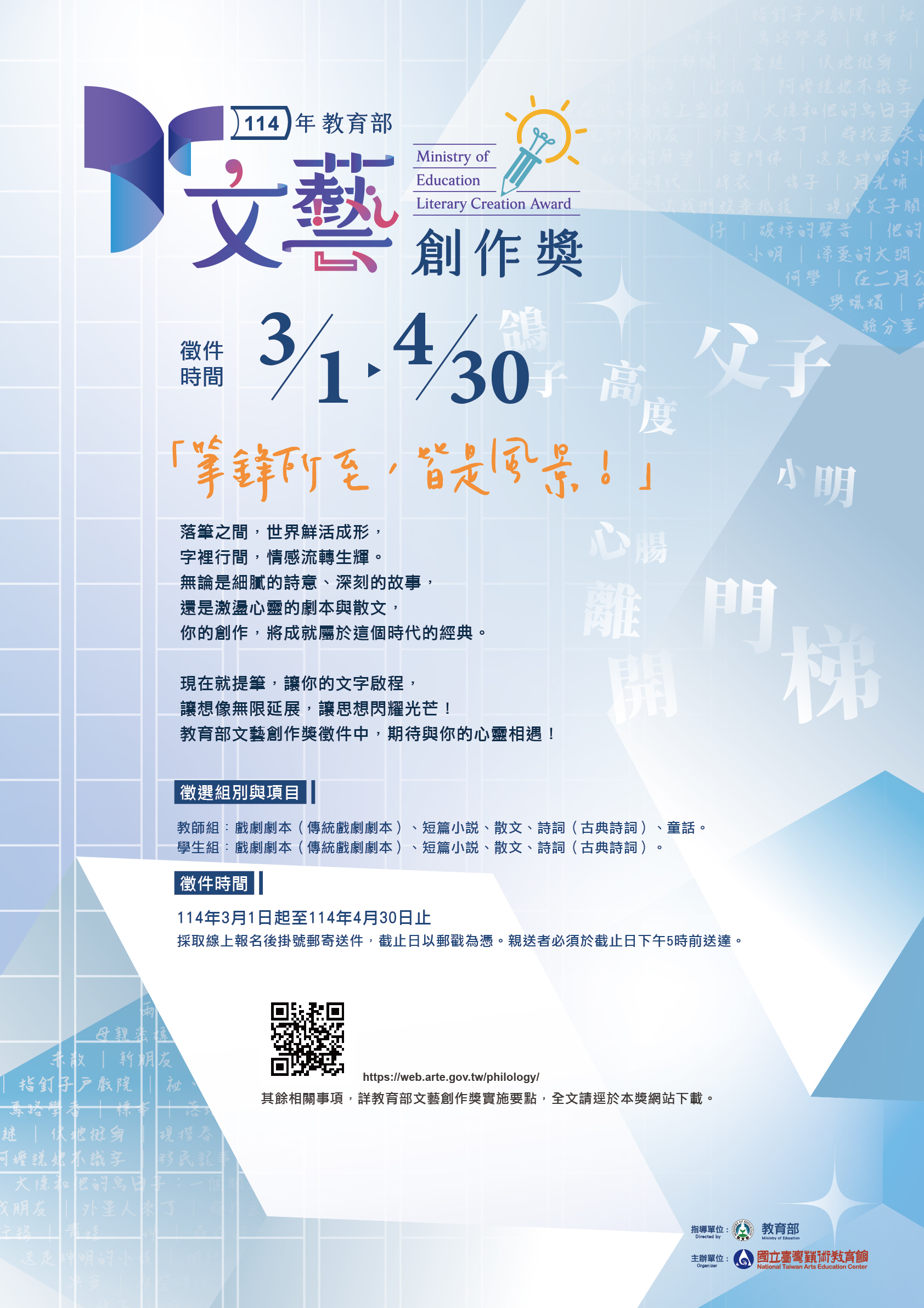 六、參選受理期間:自114年3月1日起至114年4月30日截止,採取先線上報名(網址:https://web.arte.gov.tw /philology/),後以掛號郵寄送件方式辦理,截止日以郵戳為憑;親送者必須於截止日下午5時前送達。