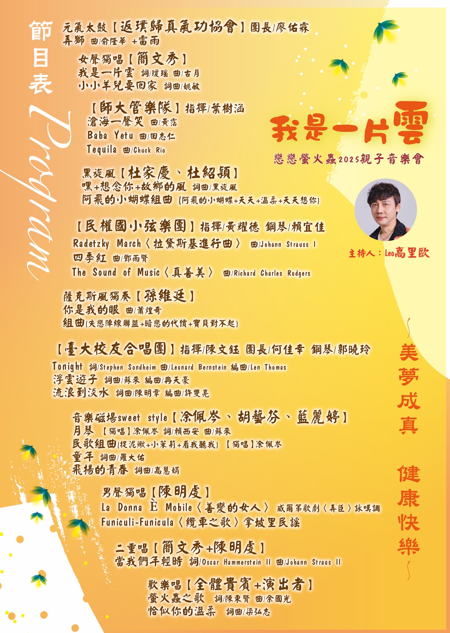 二、本次音樂會將由聲樂家簡文秀教授、陳明虔、凃佩岑、胡藝芬、藍麗婷、黑旋風、孫維廷、返璞歸真氣功協會、臺大校友合唱團、師大管樂隊、民權國小弦樂團等團體共同演出,是為一場親子同歡的音樂會。