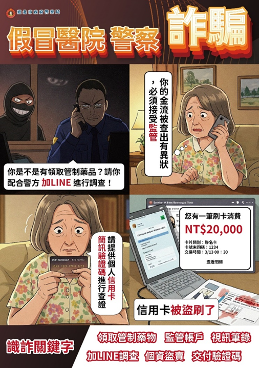 警惕假冒各種身分詐騙!勿輕信假冒「醫院警察」或「親屬」要求,保持要存疑、要確定及要連繫,避免掉入陷阱,遭人受騙。