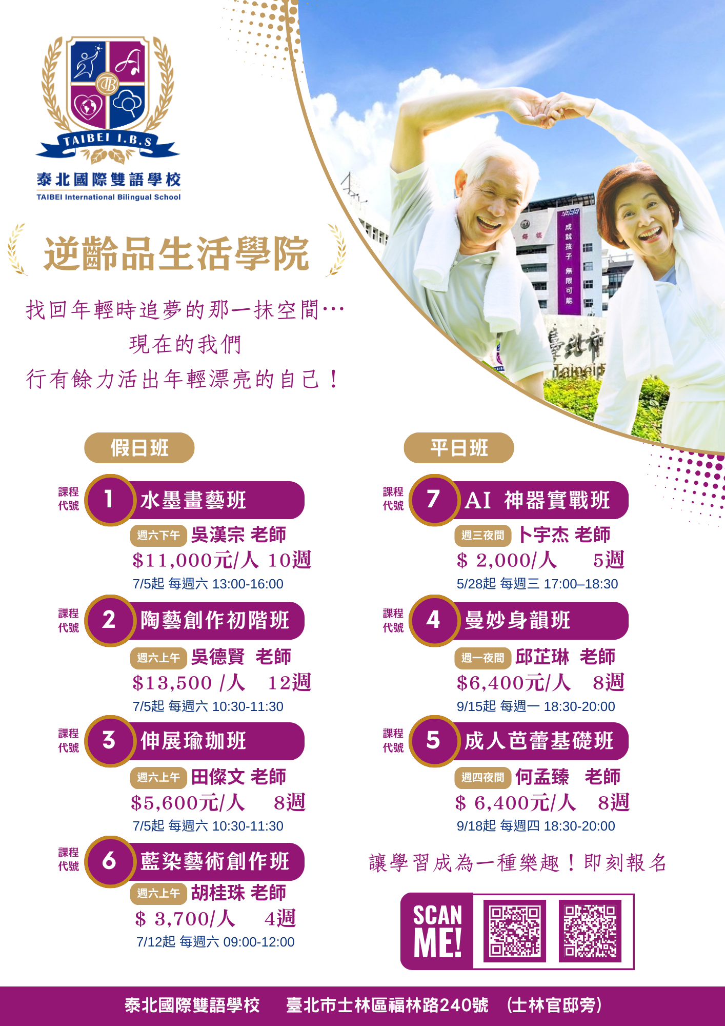 3.全英文美語領袖營(國小全學年)7/14-7/25 4.加拿大在臺遊學營(國小低中年級)8/4-8/22 5.全明星雙語籃球營(國小至國中)7/7-7/11 三、【成人週末學習課程】推出六大主題,鼓勵家長與社區居民持續學習:
