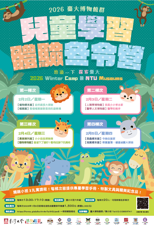 二、「悠遊一下 探索臺大:2026臺大博物館群兒童學習體驗冬令營」相關資訊如下: (一)活動日期:115年2月2日(週一)、2月3日(週二)、2月4日 (週三)、2月5日(週四)共4梯次。 (二)活動地點:本校博物館群。 (三)課程時間:每梯次13時30分至17時10分(兩館)。 (四)報名資格:國小三至六年級。 (五)開放名額:每梯次20人,可同時報名多梯次。(六)報名費用:每梯次西元2026年1月9日前報名並完成繳費享早鳥價1,500元 (原價2,000元)。 (七)報名方式:一律採網路報名,報名網址及活動詳情請見 https://forms.gle/q6ccVn4m7pXH3Jpm8。 (八)活動若遇天災或其他不可抗力因素以致無法舉行,即取消該梯次活動並全額退費。