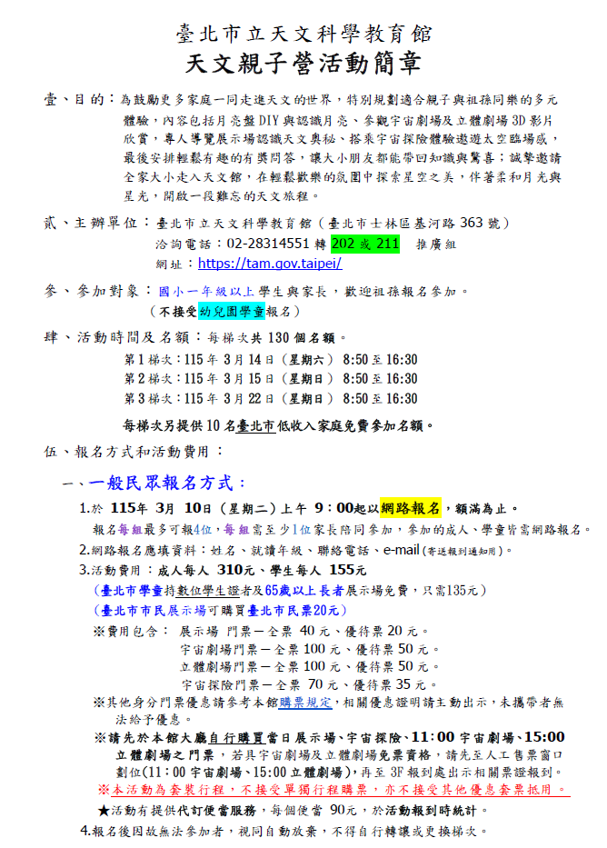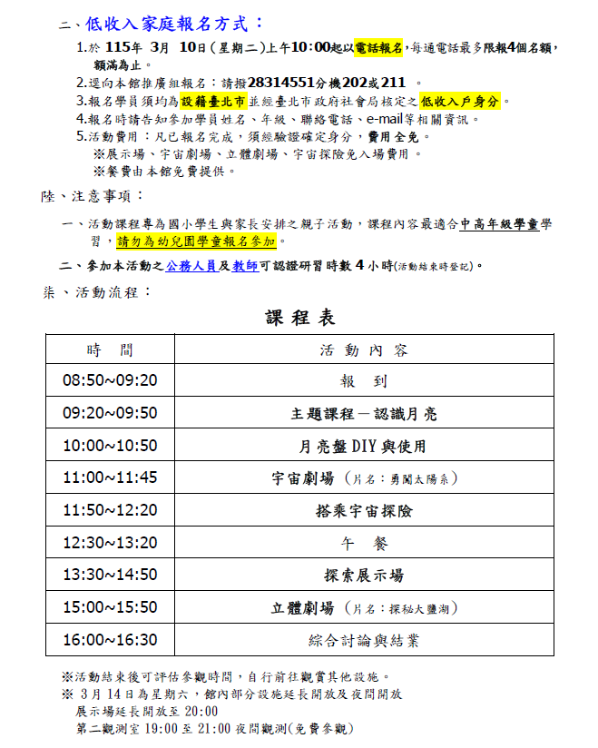 一、為關懷弱勢、照顧低收入族群,本館舉辦之「天文親子 營」活動每梯次設有10個名額,供臺北市低收入戶親子全 程免費參加,凡設籍臺北市低收入家庭完成報名經驗證確定身分者,參與本項活動全部免費。