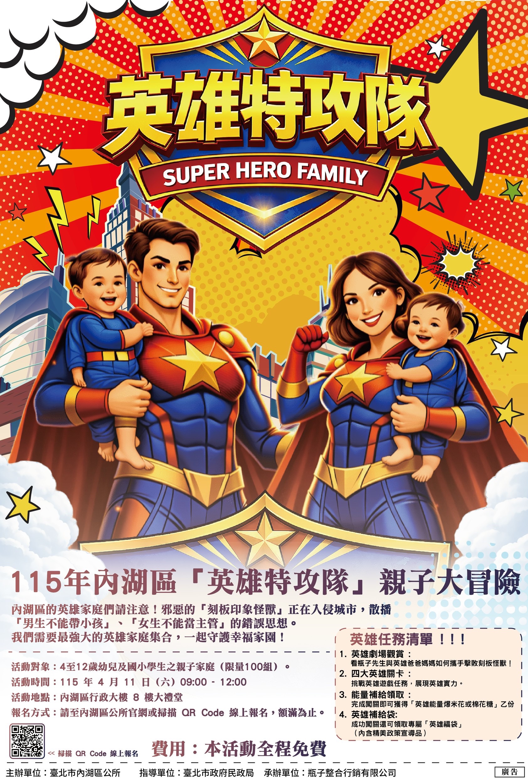內湖英雄特攻隊徵召中!115年4月11日一起擊敗 刻板印象怪獸。活動包含魔術劇場、英雄闖關摸彩及限量能量補給甜點,帶孩子體驗不一樣的英雄特訓!詳情 及報名請上內湖區公所官網查詢,手刀報名去!