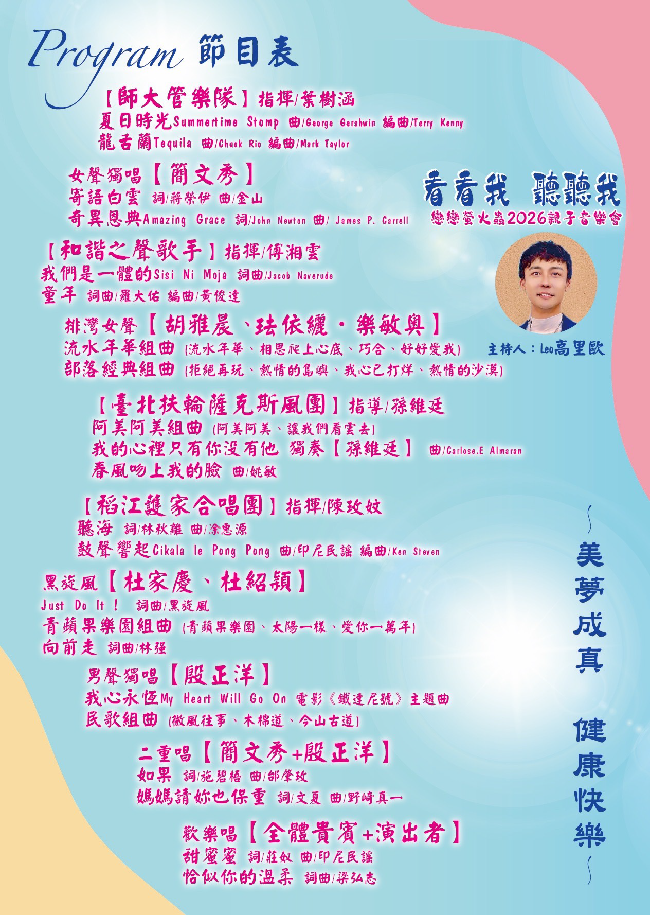 二、本次音樂會將由聲樂家簡文秀教授、殷正洋、孫維廷、黑 旋風、排灣女聲、師大管樂隊、和諧之聲歌手、稻江護家合唱團、臺北扶輪薩克斯風團等團體共同演出,是為一場親子同歡的音樂會。