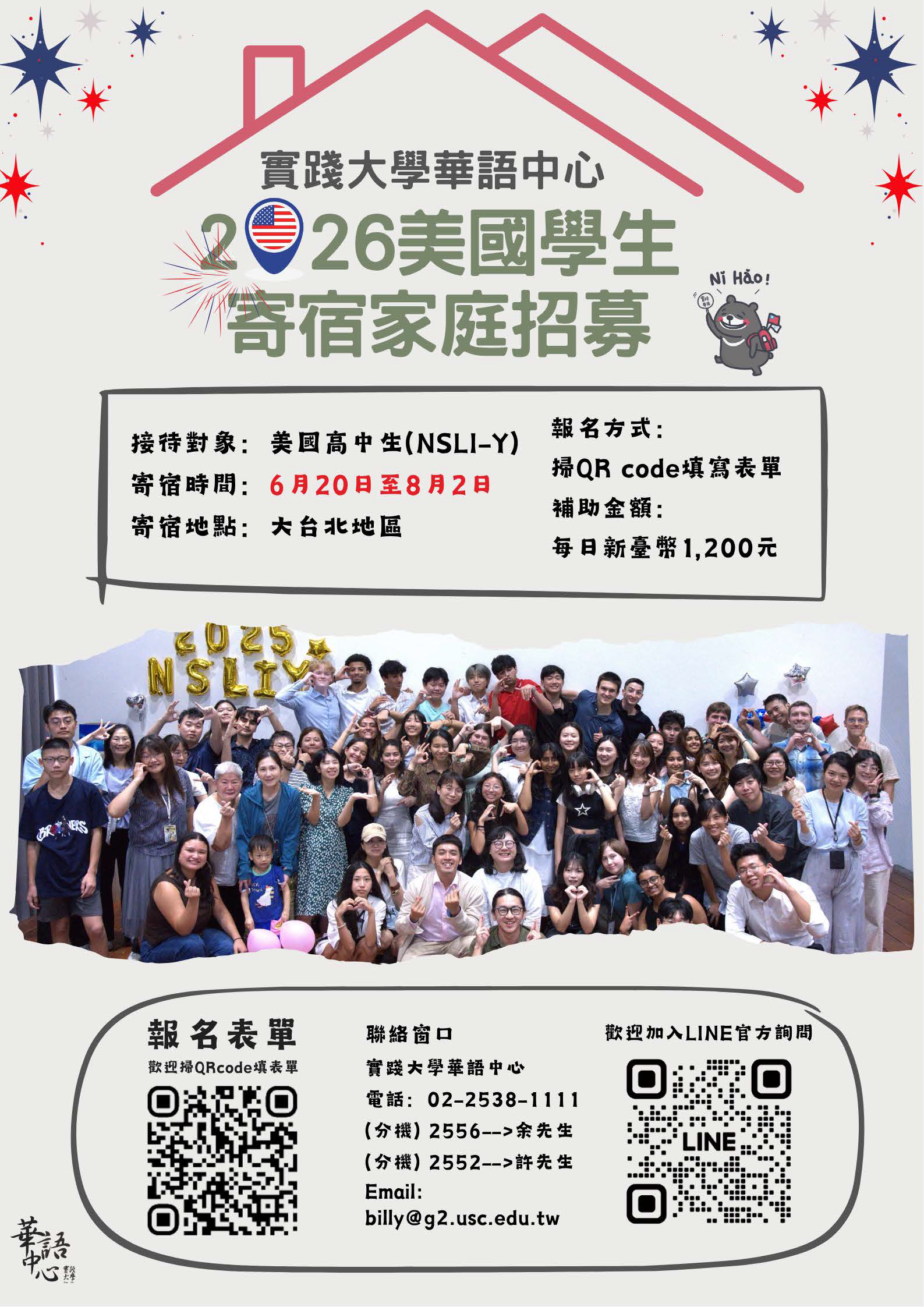 二、為深化學員在臺修讀華語課程期間與當地居民之文化交流,並培養其於日常生活中運用華語之能力,需徵求對美國文化感興趣且願意提供學員住宿接待之臺灣家庭。